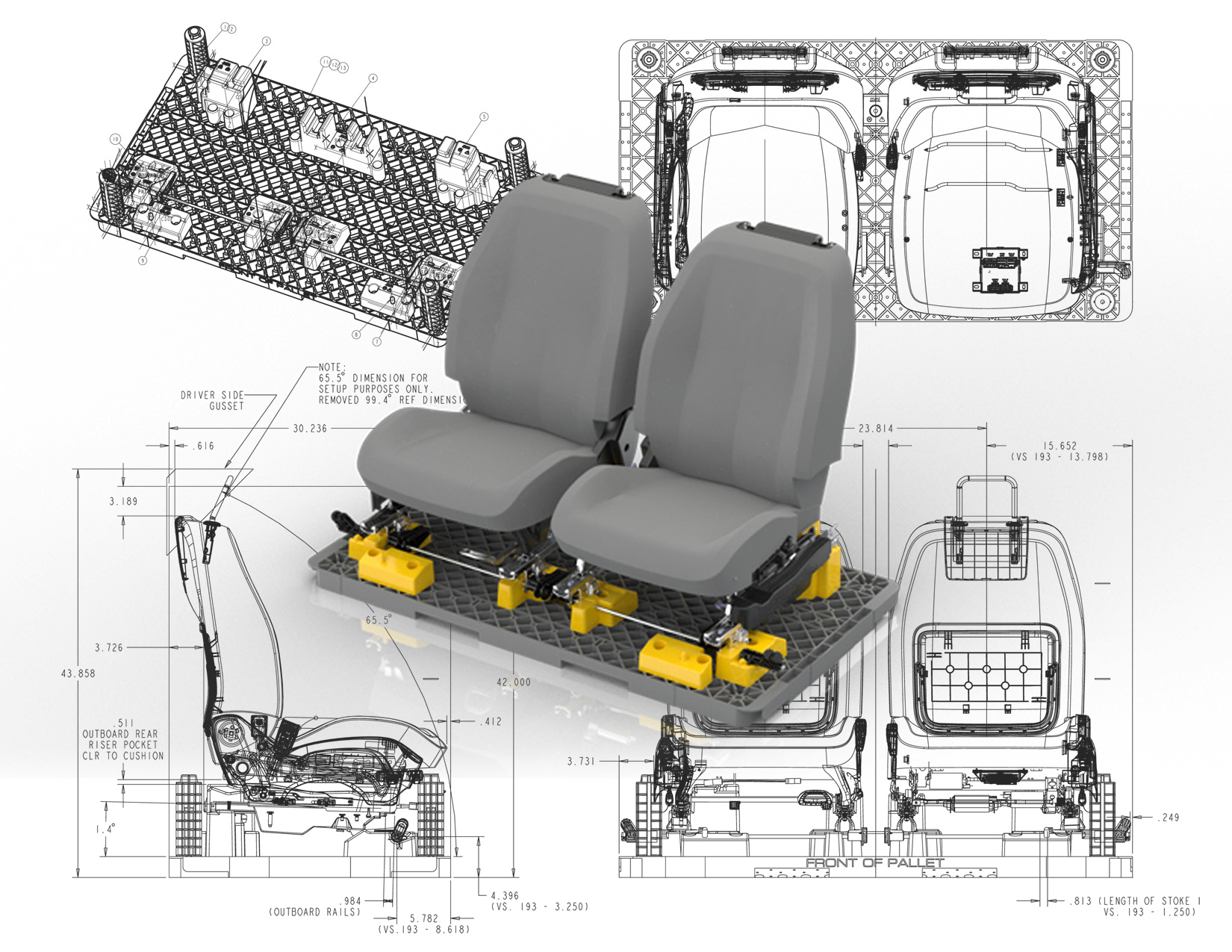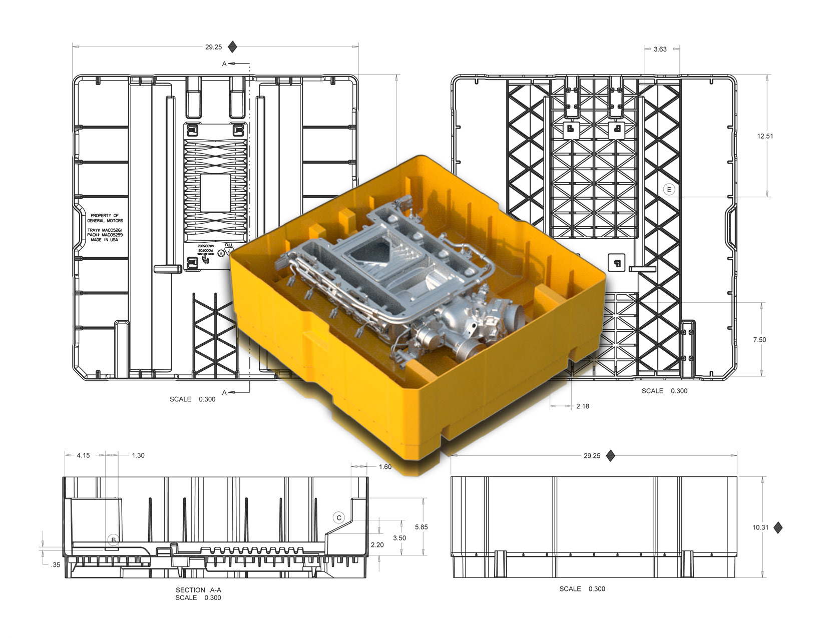 these examples are a small selection of some design engineering projects i have worked on. most of these were returnable dunnage utilizing plastic injection molding and multiple materials to provide strength and part protection.