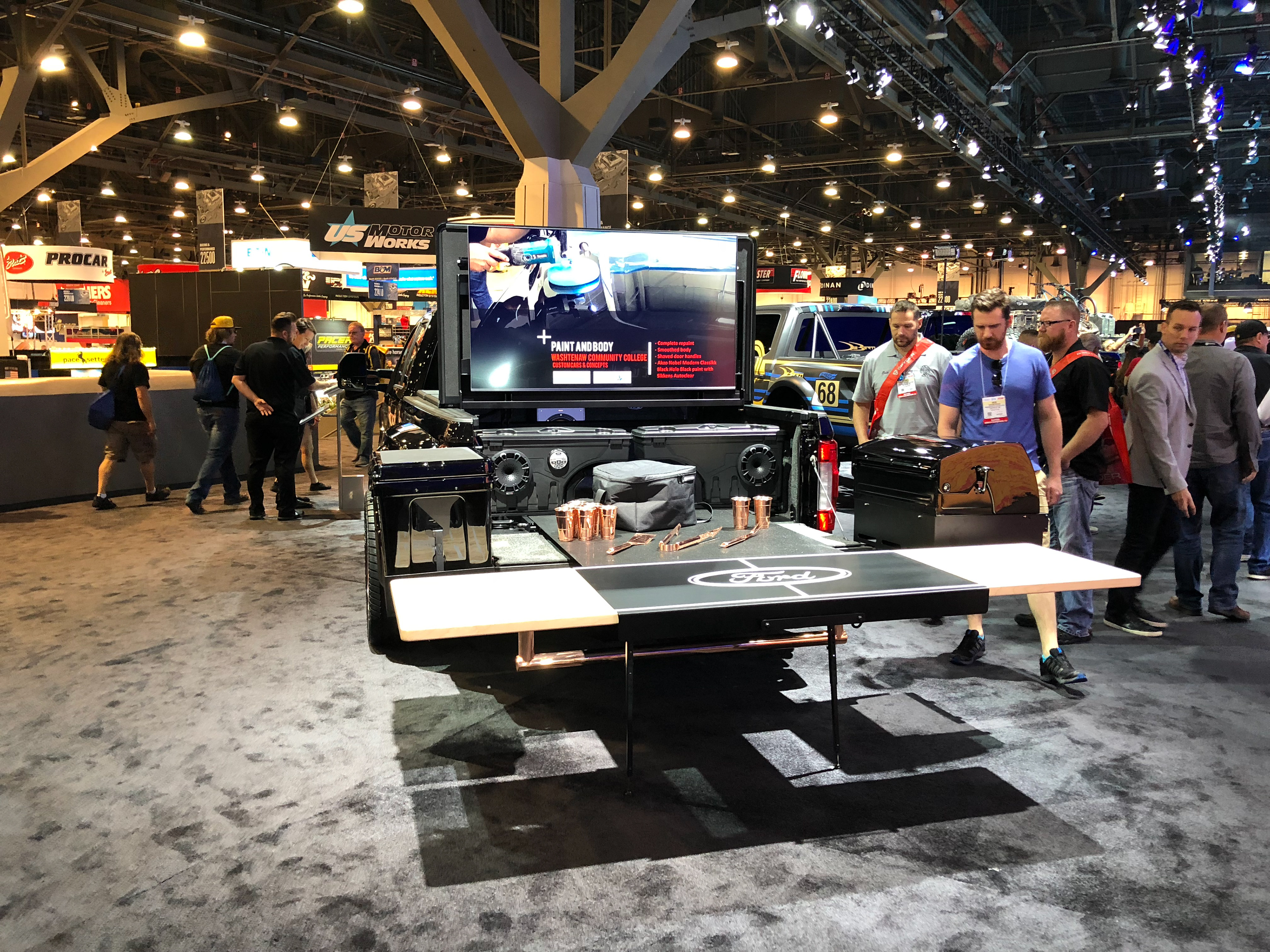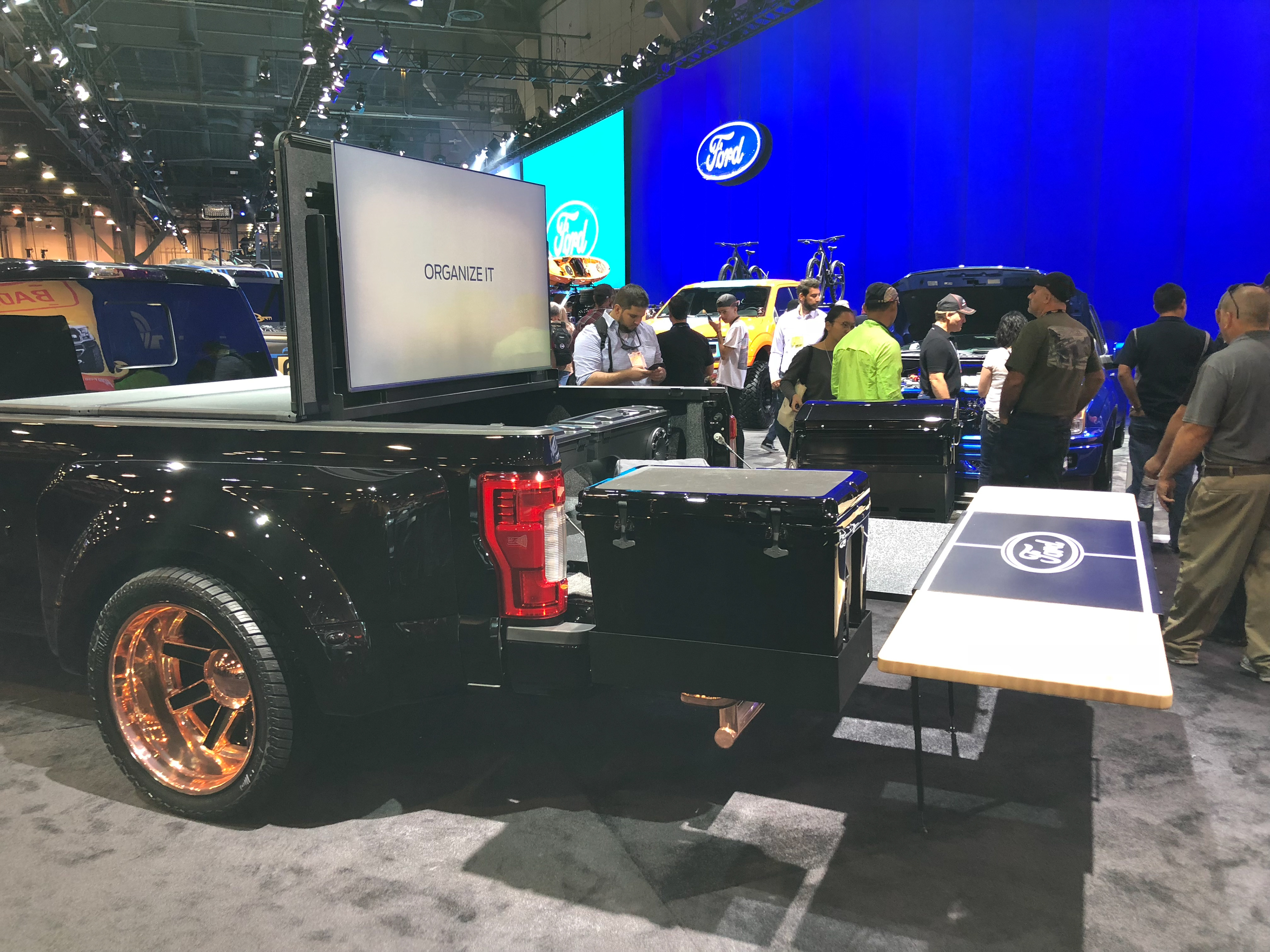 The Ultimate Tailgate truck was hand selected by Ford to be prominently displayed at the SEMA show. With the ultimate tailgate truck theme in mind this design was meant be a clean, low, and aggressive style when pulling up to any event only to reveal a 65" tv, 10" subwoofer, two 8" mids hidden in swingcases, swing out cooler an grill and of course a pull out game table for your ultimate party.